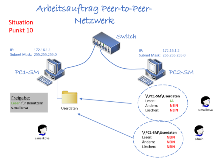 Mit dem Visio App haben wir die Freigabe nochmals grafisch dargestellt. Der Lesezugriff wie man auf dem Bild erkennen kann, ist nur für den persönlichen Benutzer „s.malikova“ möglich, Der Benutzer kann den Ordner und die Datei zwar lesen, aber keine Änderungen vornehmen. Auch das Löschen von Dateien oder Ordnern ist dem Benutzer „s.malikova“ nicht möglich. Der Benutzer Admin hat keinen Zugriff.