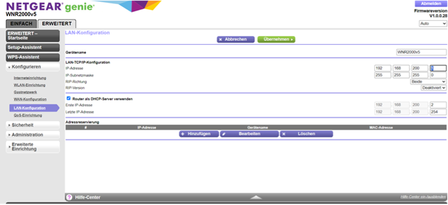 Als Erstes haben wir unseren Laptop mit dem Router verbunden, unter Ausführen „cmd“ gaben wir den Befehl „ipconfig“, um die IP-Adresse des WLAN-Routers herauszufinden. Danach suchten wir mit einem Browser nach der IP-Adresse und mit dem vorgegebenen Passwort und Benutzernamen gelangten wir auf die Konfigurationsseite des Routers. Zunächst gaben wir den WLAN-Router die fixe IP-Adresse 192.168.200.1 und eine dazu passende Subnet-Mask und aktivierten die DHCP-Funktion, dass er über einen Adress-Pool von 100 zu seinem Netz passenden IP-Adressen für die Clients verfügt.