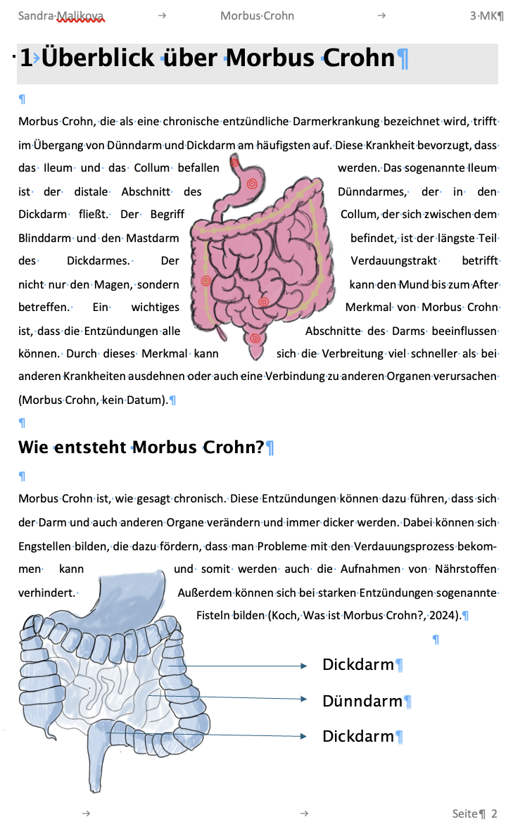Im Portfolio ging es um Ursachen, Symptome, Diagnose, Komplikationen sowie Therapie, Prognose und mögliche Operationen. Die genauen Ursachen sind noch nicht vollständig bekannt, aber Umweltfaktoren können das Risiko erhöhen. Typische Symptome sind Bauchschmerzen, Durchfall und Gewichtsverlust. Morbus Crohn ist nicht heilbar, kann aber gut behandelt werden. Ich habe eigene Zeichnungen, Fotos und lizenzfreie Bilder verwendet und am Ende ein korrektes Quellenverzeichnis mit Titel und Abrufdatum eingefügt.