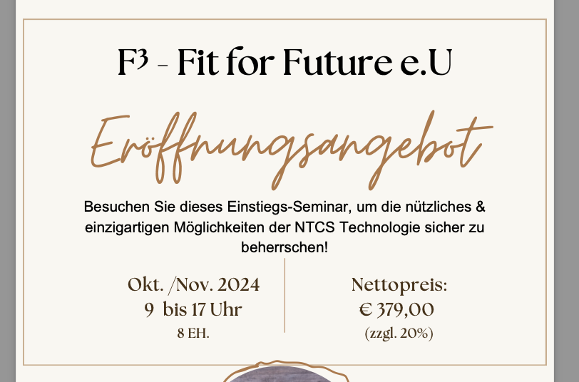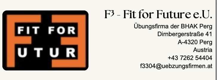In der 4. Klasse hatten wir in BPQM den Auftrag einen Eröffnungsflyer für unsere Übungsfirma „F3 Fit for Future e.U.“ zu erstellen. Hierbei hatten wir die Wahl entweder InDesign oder Canva zu nutzen. Der Flyer war für ein Seminar gedacht, das im Oktober und November 2024 von 9 Uhr bis 17 Uhr stattfinden sollte.