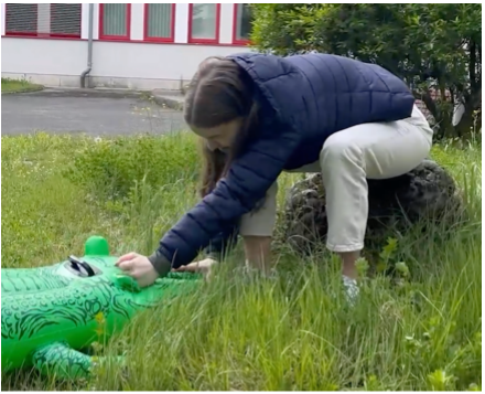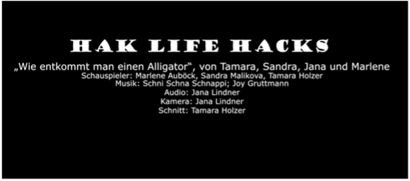In unseren Deutsch Unterricht in der 3. Klasse durften wir ein Video drehen. Wir teilten uns in Gruppe von drei bis vier Personen auf und suchten uns ein Thema aus. Unser Thema war „Wie entkommt man einem Alligator?“ Der Text bestand aus Tipps und als erstes übersetzten wir den englischen Text ins Deutsche. Danach überlegten wir wo und wie wir diese Szenen darstellen könnten. Eine unserer Teamkollegin nahm ein aufblasbares Krokodil mit. Jana war unsere Moderatorin, Marlene, Tamara und Ich waren die Schauspielerinnen. Unser Drehort war im Schulgarten.