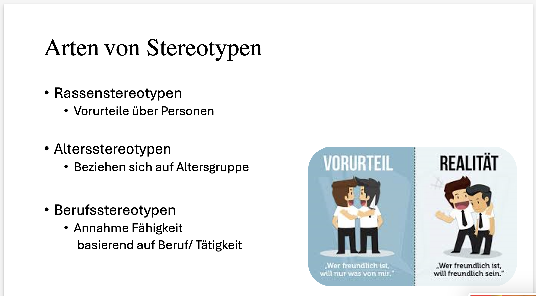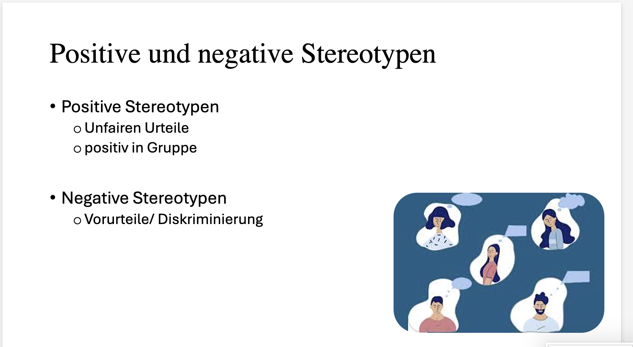 Ein Stereotyp ist eine stark vereinfachte Vorstellung über eine Person oder Gruppe, die sich häufig auf bestimmte Merkmale wie Herkunft, Alter, Beruf oder Geschlecht bezieht. Auch wenn sie manchmal auf tatsächlichen Beobachtungen basieren, führen sie oft zu Vorurteilen und dskirimierendem Verhalten, da sie individuelle Unterschiede ignorieren. Besonders spannend war für mich die Auseinandersetzung mit Experimenten, die die Wirkung von Stereotypen wissenschaftlich belegen.