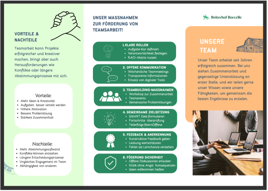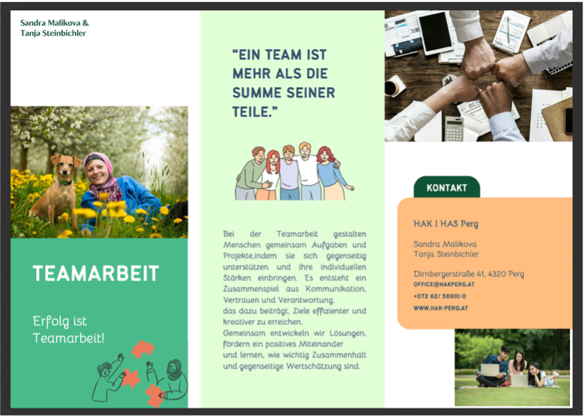 Der Flyer sollte eine übersichtliche, ansprechende, aber auch informative Darstellung bieten. Die Farbwahl fiel auf grün-blau Töne, wodurch eine ruhig, vertrauensvolle und harmonische Wirkung erzielt werden soll. Die zentralen Aspekte, wie klare Rollenverteilung, offene Kommunikation, Maßnahmen und Ziele sollten behandelt werden sowie die Vorteile und Nachteile der Teamarbeit sollten hervorgehoben werden. Zusätzlich verwendeten wir Bilder und Grafiken, die das Thema besser verständlicher machen. Teamarbeit bedeutet nicht einfach nur gemeinsam Projekte zu entwickeln und erfolgreich zu sein, sondern es bedeutet, dass jeder in einer Gruppe seine Stärken und Schwächen zeigen kann. Somit kann jeder von jedem etwas Neues lernen und ohne dabei jemanden herunterzumachen. Denn jeder ist anders und jeder hat bestimmte Fähigkeiten, die er am besten einsetzten und auch teilen kann.